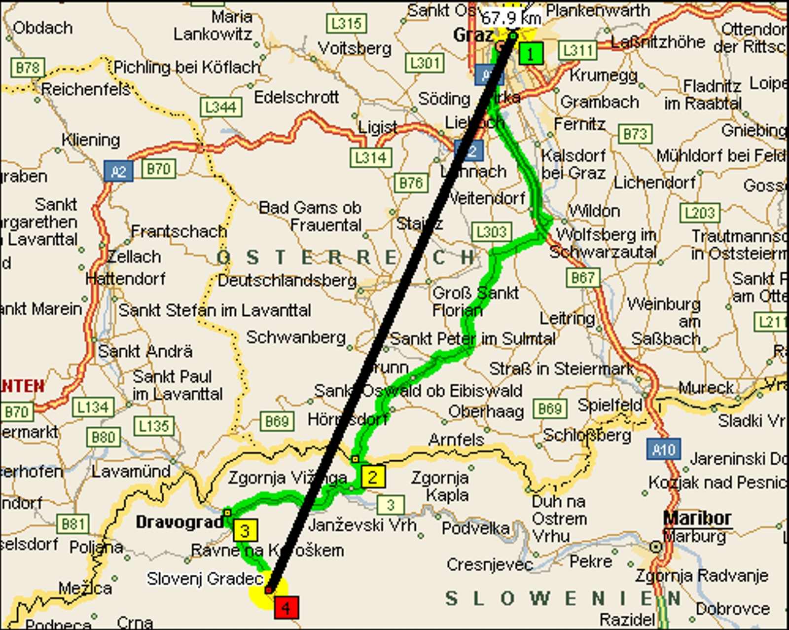 Tunnellinie (Luftlinie) 67,9 km | Microsoft Maps | Straßenverbindung ca. 100 km