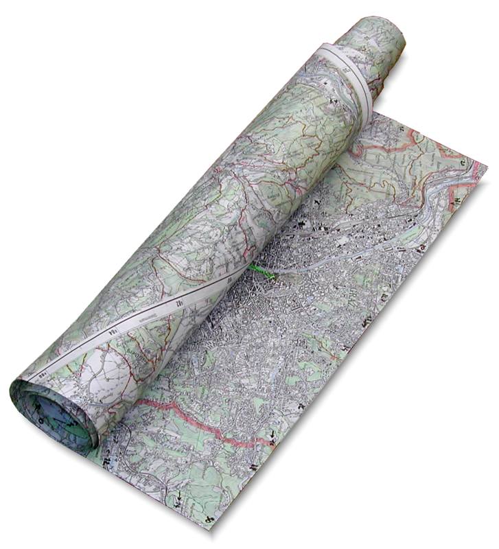 Neun Einzel-Wanderkarten zusammengeklebt; danach einen Streifen herausgeschnitten und zusammengerollt. Zwei Stück produziert; eine Rolle ist abhanden gekommen.