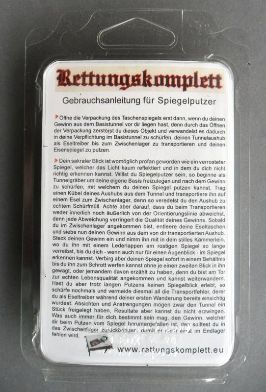Der Spiegel ist mit vier durchsichtigen Halterungen in die räumliche Mitte des Verpackungsraumes eingeklebt, so dass er die Verpackung nicht direkt berührt. Öffne die Verpackung des Taschenspiegels nur dann, wenn du deinen Gewinn aus dem Basistunnel bereits vor dir liegen hast, denn durch das Öffnen vewandelst du dieses Objekt in deine Verpflichtung im Basistunnel zu graben, deinen Aushub als Eseltreiber bis zum Zwischenlager zu transportieren und letztlich, denn darin befindlichen Spiegel zu putzen, denn der Spiegel ist das Gleichnis eines verrosteten Herzens, welches kaum mehr Licht reflektieren kann und in dieser Dunkelheit nichts erkennt.