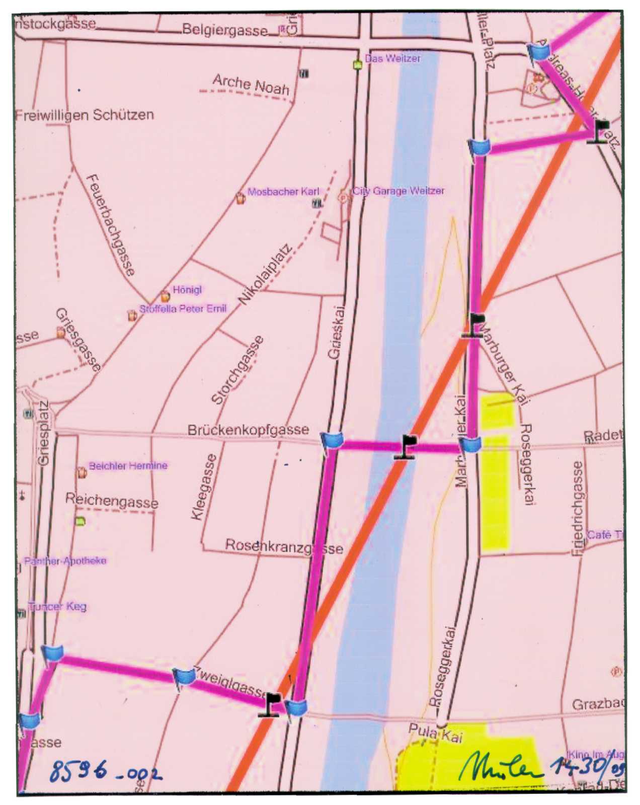 Karte für den Aushubtransport / Ausschnitt Graz Richtung Zwischenlager Radlpass; die Orientierungslinie ist rot eingezeichnet.