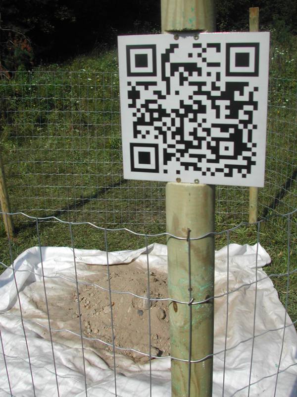 Smartcodetafel am Zwischenlager  |  Lasergravur auf Aluminium |  19 x 19 cm |  angeschraubt auf Holzpfahl