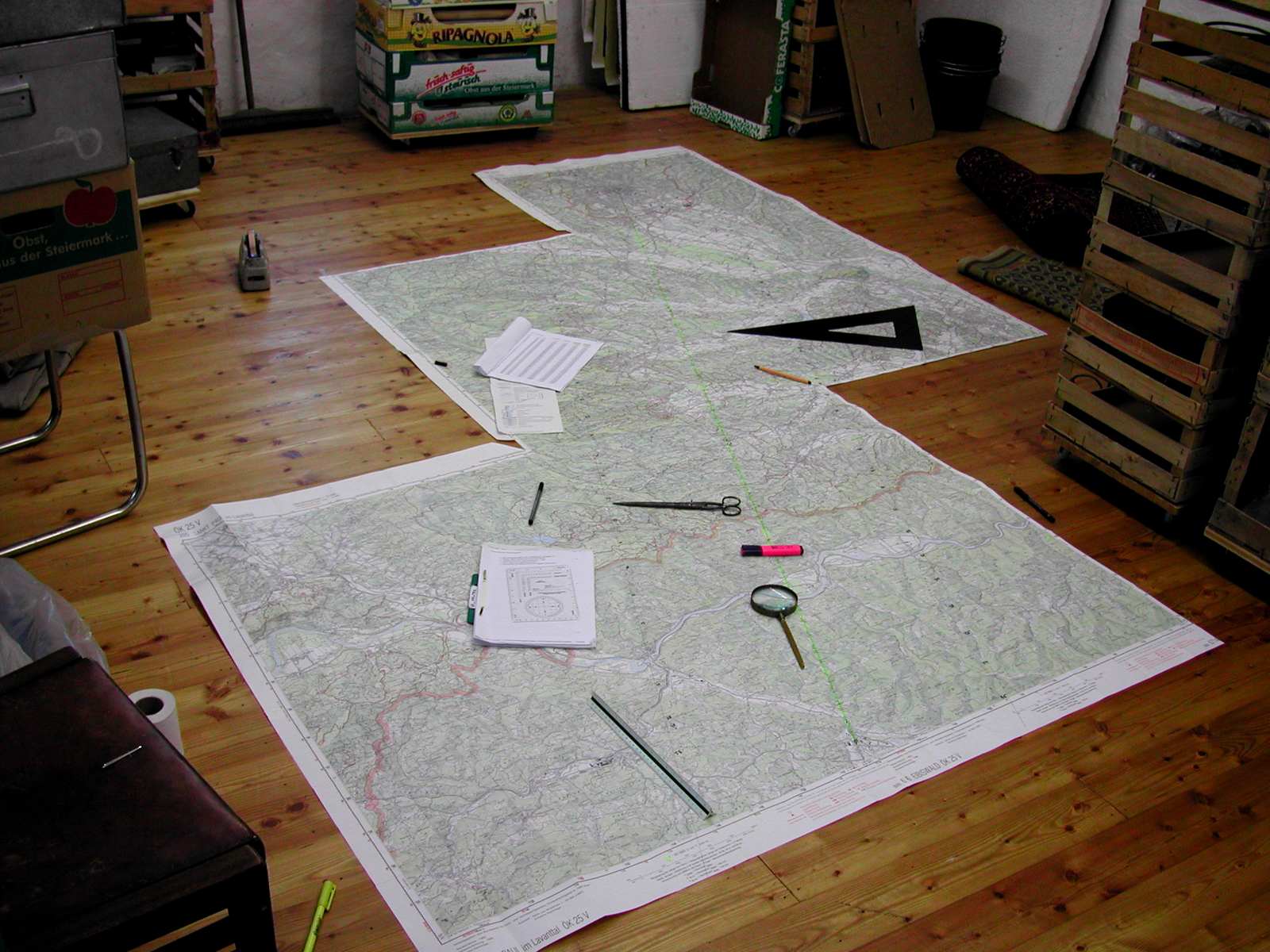 Neun Einzel-Wanderkarten zusammengeklebt; danach einen Streifen herausgeschnitten und zusammengerollt. Zwei Stück produziert; eine Rolle ist abhanden gekommen.