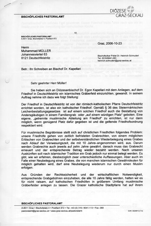 Errichtung Islamischer Friedhöfe in der Steiermark bringen, so wirft
