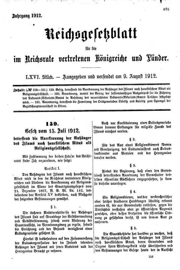 Kaiserliche Anerkennung der Anhänger des Islam nach hanefitischem Ritus als Religionsgesellschaft - 1912