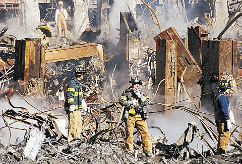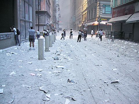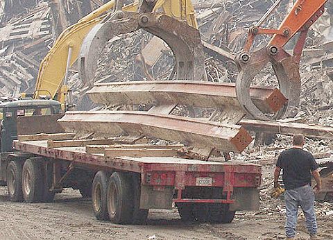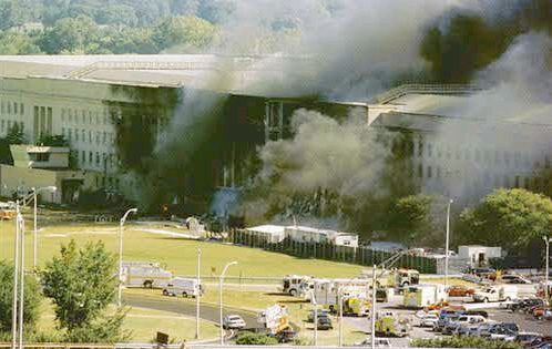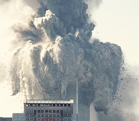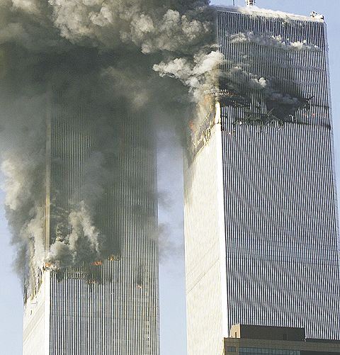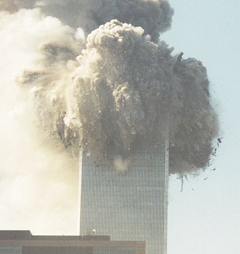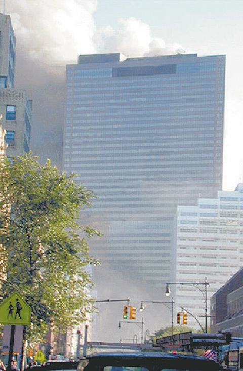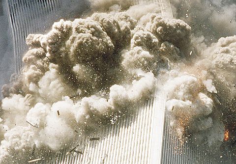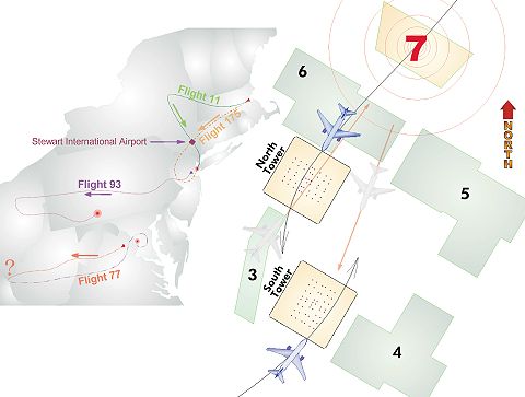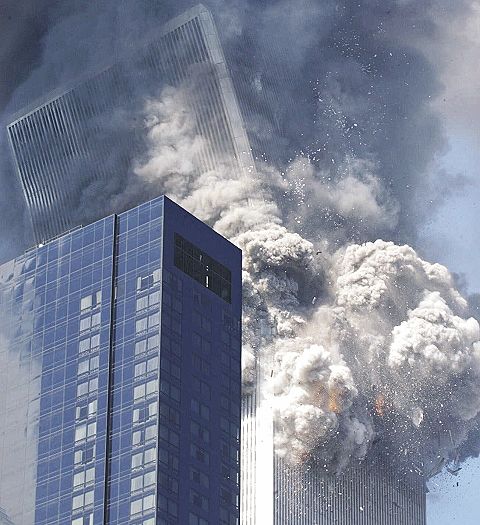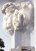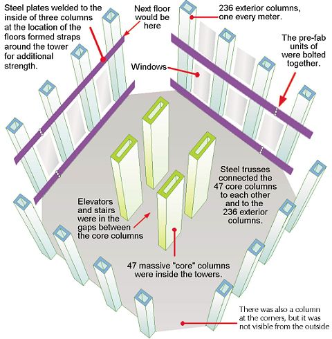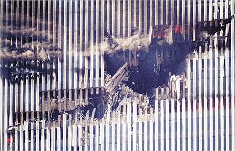 Der Ausschnitt zeigt die 45 zerschnittenen äusseren Säulen. Das sind nicht mehr als rund 20% der 237 mit feuerhemmendem Material ummantelten Säulen. 80% blieben stehen. Die Türme waren auf den Aufprall derartiger Passagiermaschinen ausgelegt, ebenso wie auf die wuchtigen Winterstürme. Man sieht die schwarze Höhle, in der kaum noch Feuer auszumachen ist. Die Feuerwehr hat die 73. Etage bereits erreicht und fordert 3 Mannschaften zum Löschen der kleineren Restfeuer an. Auf dem Bild sieht man Menschen, die zwischen den Säulen ins Freie schauen. Die Bush Regierung behauptet, das brennende Kerosin habe die Türme später zum Einsturz gebracht. Das hat es in 120 Jahren der Technik des Stahlskelettbaus noch nie gegeben, dass Feuer derartige Gebäude zum Einsturz bringen konnte. Die auf dem Stockwerk zu sehenden Zeugen empfinden nicht die Hitze, warten auf Rettung, die Feuerwehr will sich ans Löschen machen. Der Nordturm wird als erster getroffen, bleibt jedoch bis 10:28 stehen. Der um 9:03, folglich später und weniger schwer getroffene Südturm sackt bereits um 9:59 in sich zusammen.