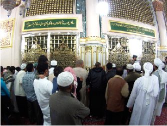 Muslimische Männer vor dem Grab Mohammeds in der