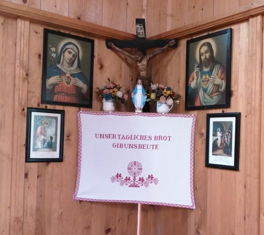 Musealisierter Herrgottswinkel .. In Haushalten, vor allem in bäuerlichen, ist der Herrgottswinkel noch zu finden, doch früher war das am Land eine Pflichteinrichtung, während Goethe die Lehre von der Kreuzigung Jesu zwecks Erlösung der Menschheit bereits ablehnte. Meist sind dort figürliche und bildliche Darstellungen vom "Gottessohn" am Kreuz und der "Gottesmutter" neben weiteren Erinnerungen an Erzählungen aus der Bibel. ott Vater (in Abbildungen meist ein alter Mann) und der Heilige Geist (oft als taube dargestellt) fehlen. Das geistige Getränk wird am Tisch unter dem Herrgottswinkel konsumiert, auch wenn er geweiht wurde. Ähnlich wie in Indien, haben Katholiken keine Definition von "Götzendienst", auss er dass das Abbeten von anderen Figuren, also solche die nicht Gott darstellen, Götzendienst sei; das Thema ist im Katholizismus eher unbekannt. Frauen hatten früher noch Zeit zum Sticken von Gebeten, wie im Bild des musealisierten Herrgottswinkel. Aber nicht nur dieser Herrgottwinken, sondern Kirchen generell sind mehr oder weniger musealisiert.