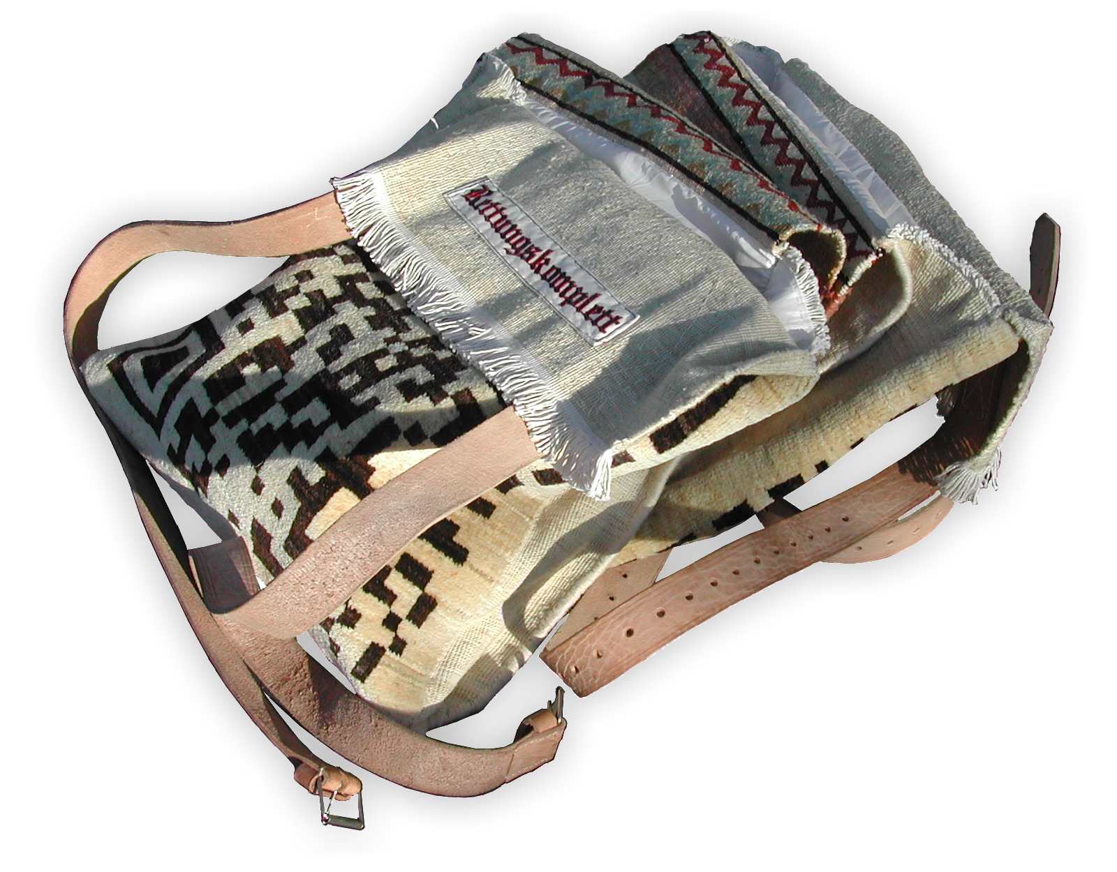. Eseltaschen dienen Eseltreibern zum Transportieren von Aushubmaterial aus dem Basistunnel. Die Eseltaschen wurden in einem Stück gewebt bzw. geknüpft und mit Ledergurten versehen. Jede dieser Eselttasche hat auf ihren Aussenseiten einen RQ-Codes, der mit Wolle von schwarzen und weissen Schafen geknüpft ist. Im Mittelteil, dort wo die Tacshe über dem Rücken des Esels hängt, ist ein individuelles Muster des Knüpfers eingewebt. Die Kunstseidefütterung im inneren der beiden Kammern dient den Spiegelputzern zur Sicherung des feinsten Schürfmülls während des Transports bis zum Zwischenlager. Die geknüpften Smartcodes dienen mittels Rettungsm@il zur Überwachung des aus dem Basistunnel abtransportierten Aushub. Die Befestigung der Eseltaschentaschen am Esel erfolgt mittels Packsattel. . Zur Befestigung der Eseltaschen am Esel damit diese während des Aushubtransports nicht verrutschen. . Ausrüstung und Werkzeuge für Tunnelgräber, Eseltreiber und Spiegelputzer. Die Werkzeuge sind Gleichnisse für die Arbeit an der eigenen Seele. Es ist hilfreich, diese Werkzeuge als spirituelle Instrumente zu betrachten. . Als Eseltreiber transportierst du deinen Aushub aus dem Basistunnel am Rücken eines Esels vom Tunneleingag in Graz oder in Gradez bis zum Zwischenlager. Dieser Aushubtrabsport - eines selbst gesuchten Eseltrecks entlang der Orientierungslinie - kann dir ein unvergleichliches Erlebnis sein. Hast du aber die Absicht Spiegelputzer zu sein, erlebst du deinen Aushubtransport als heiklen sakralen Prozess. Solltest du keinen eigenen Esel besitzen, kannst du dir (bis es eine Betriebseigene Eselzucht gibt) irgendwo einen Esel mieten oder kaufen. Du kannst allein mit einem Esel oder in der Gruppe mit mehreren Eseltreibern bzw. Esel transportieren. |