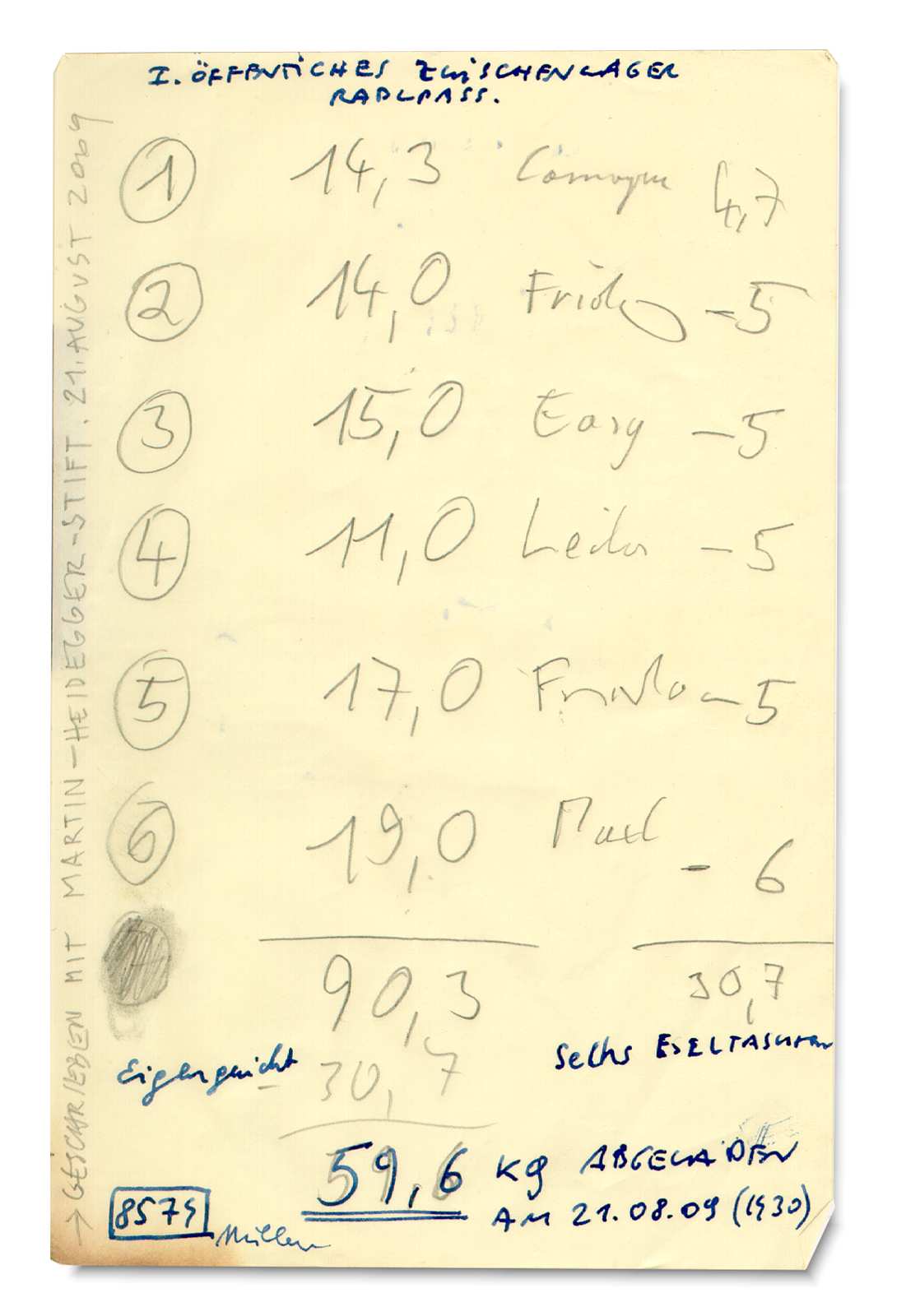 168 x 108 mm | Bleistift, Füllfeder auf Persia Dünndruckpapier | 1430 (2009) | Gewicht des Aushubs des 1.Aushubtransports Graz - Radlpass | 21.09.2009 | geschrieben von Michaela Herites mit dem Martin Heidegger Bleistift des Joachim Baur | Füllfeder