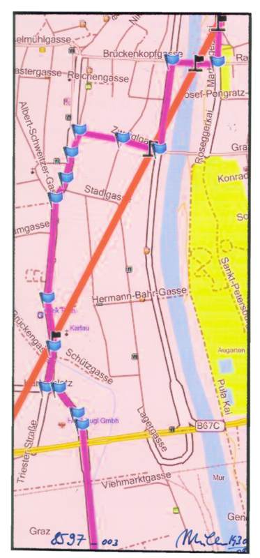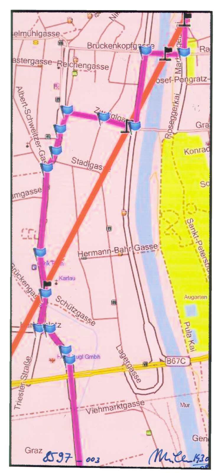 Karte für den Aushubtransport / Ausschnitt Graz richtung Zwischenlager Radlpass; die Orientierungslinie ist rot eingezeichnet.