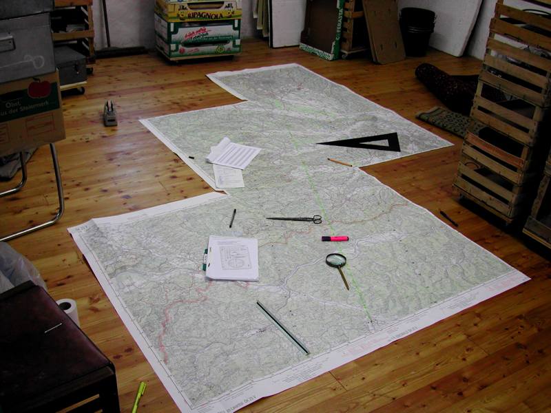 Neun Einzel-Wanderkarten zusammengeklebt; danach einen Streifen herausgeschnitten und zusammengerollt. Zwei Stück produziert; eine Rolle ist abhanden gekommen.