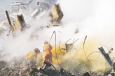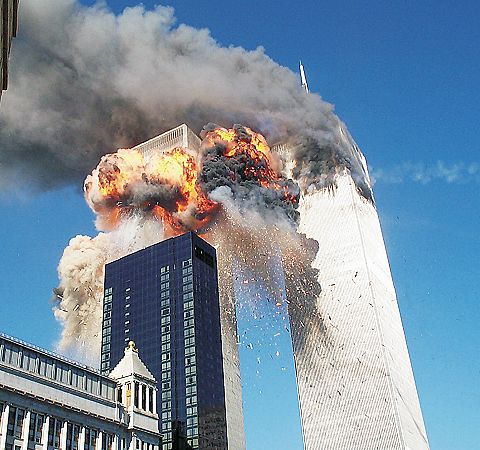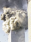 Der Ausschnitt zeigt die 45 zerschnittenen äusseren Säulen. Das sind nicht mehr als rund 20% der 237 mit feuerhemmendem Material ummantelten Säulen. 80% blieben stehen. Die Türme waren auf den Aufprall derartiger Passagiermaschinen ausgelegt, ebenso wie auf die wuchtigen Winterstürme. Man sieht die schwarze Höhle, in der kaum noch Feuer auszumachen ist. Die Feuerwehr hat die 73. Etage bereits erreicht und fordert 3 Mannschaften zum Löschen der kleineren Restfeuer an. Auf dem Bild sieht man Menschen, die zwischen den Säulen ins Freie schauen. Die Bush Regierung behauptet, das brennende Kerosin habe die Türme später zum Einsturz gebracht. Das hat es in 120 Jahren der Technik des Stahlskelettbaus noch nie gegeben, dass Feuer derartige Gebäude zum Einsturz bringen konnte. Die auf dem Stockwerk zu sehenden Zeugen empfinden nicht die Hitze, warten auf Rettung, die Feuerwehr will sich ans Löschen machen. Der Nordturm wird als erster getroffen, bleibt jedoch bis 10:28 stehen. Der um 9:03, folglich später und weniger schwer getroffene Südturm sackt bereits um 9:59 in sich zusammen.