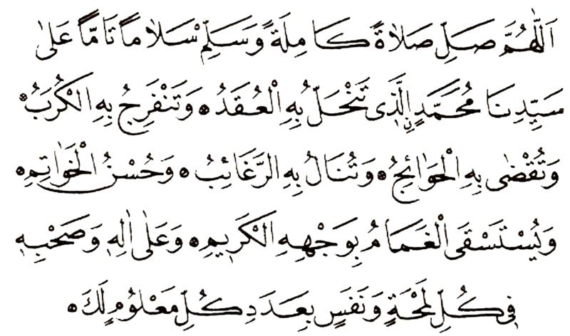 Allah! Schenke Sayyidina Muhammad vollkommenen Segen und vollkommenen Frieden und mögen uns seinetwillen alle unsere Schwierigkeiten beseitigt werden, alles Unheil und alle Seelenangst von uns abgewendet werden; all unsere Bedürfnisse erfüllt werden; alle uns lieb und werten Wünsche erfüllt werden; und ein glückliches Ende (mit Imaan) des irdischen Lebens erreichen; und gib uns Regen schauernde Wolken durch das großherzige Antlitz des Propheten, und schenke Segen sowohl als auch Frieden seiner Familie und seinen Gefährten in jedem Augenblick und bei jedem Atemzug, so viele Male, wie in Deinem Wissen ist´.