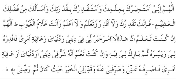 Allahumma inni astakhiruka bi-‘ilmika wa astaq-diruka bi-qud-ratika wa as aluka min fadlika-l-azim, fa innaka taqdiru wala aqdir, wa ta‘lamu wala a‘lam, wa anta allamu-l-ghu-yūb. Allahumma in kunta ta‘lamu anna (hadha-l-amra = hier deine Angelegenheit in deiner Sprache sprechen) khairun li fi dini wa fi dunjaa wa aqibati amri, faq-durhu li wa yassirhu li, thumma barik li fih, wa inn kunta ta‘lamu anna hatha-l-amra sharrun li fi dini wa maashi wa aqibati amri (fi ajili amri wa ajilihi), fas-rifhu anni was-rifni anhu waqdur li-ya-l-khaira ḥaithu kan, thumma-r-dini bih.